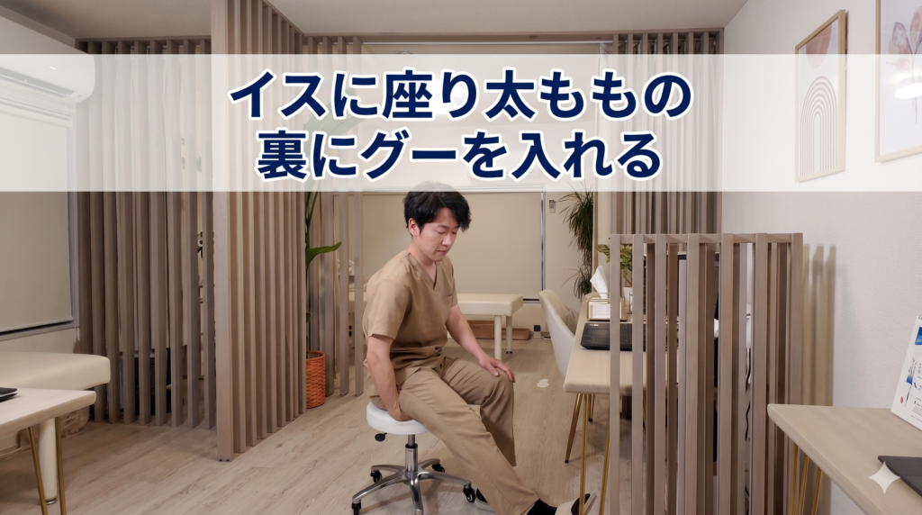 まず、イスに座った状態でこぶしを作り、太ももの裏に入れ込みます。