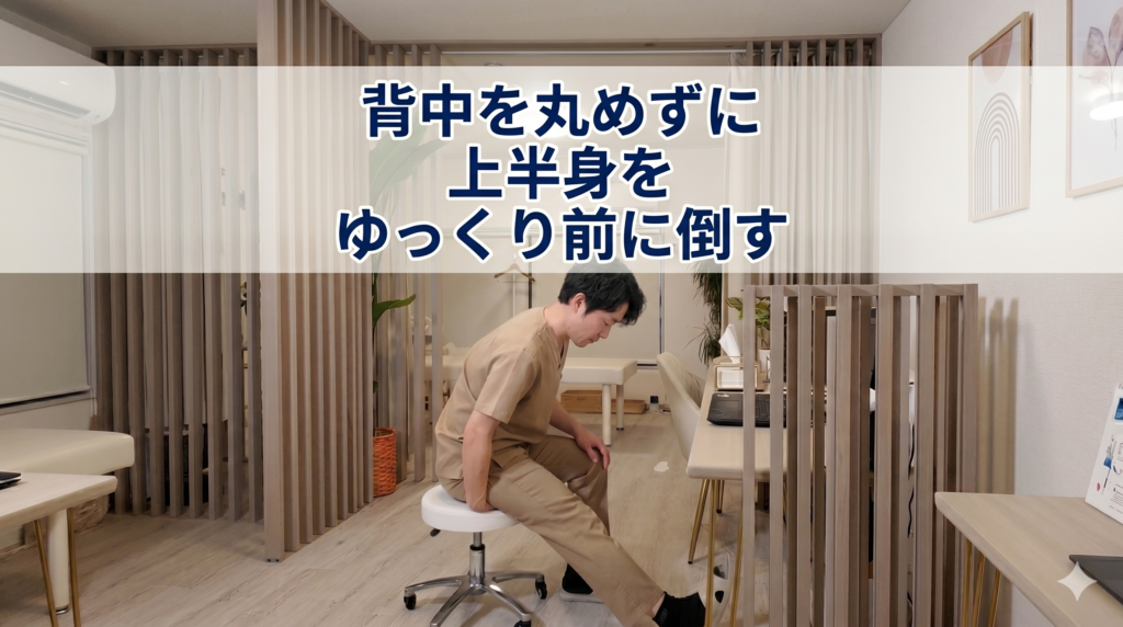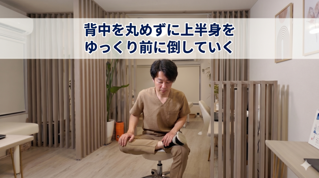 背中を丸めないようにしながら、上半身を前に倒していきます。