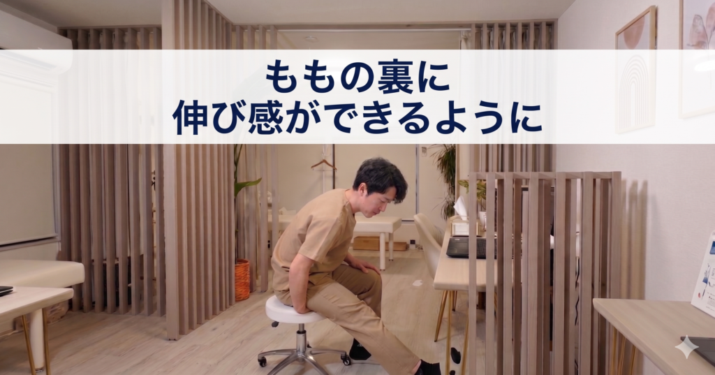 お尻がじわっと伸びていればOKです。その体勢で10秒間キープし、同じ内容を反対側の足でも行います。