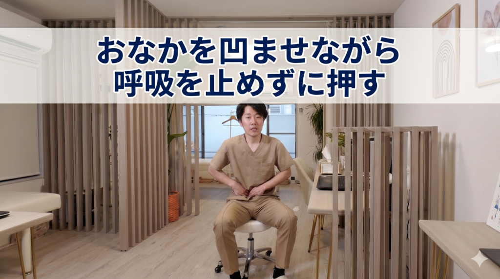 グリグリするのを続けた状態で、おなかを凹ませながら呼吸をします。これを10秒間キープし、同じ内容を反対側でも行います。