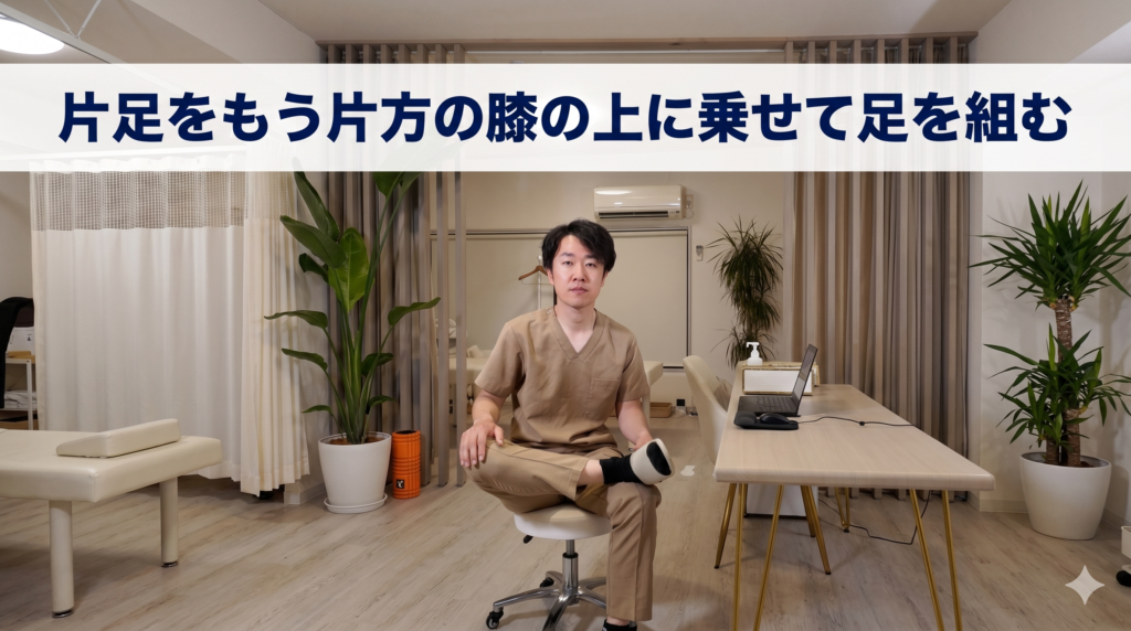 最後に、片足をもう片方の膝の上に乗せて足を組みます。